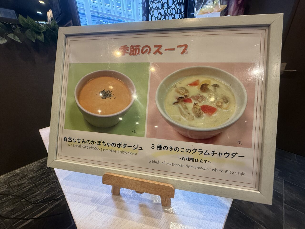日替わりランチのスープは2種類です。(季節によってスープの種類は変わります。) スープマイスターが作る季節のスープ、どちらにしようか悩みましたがこの日は「かぼちゃのポタージュ」に♪