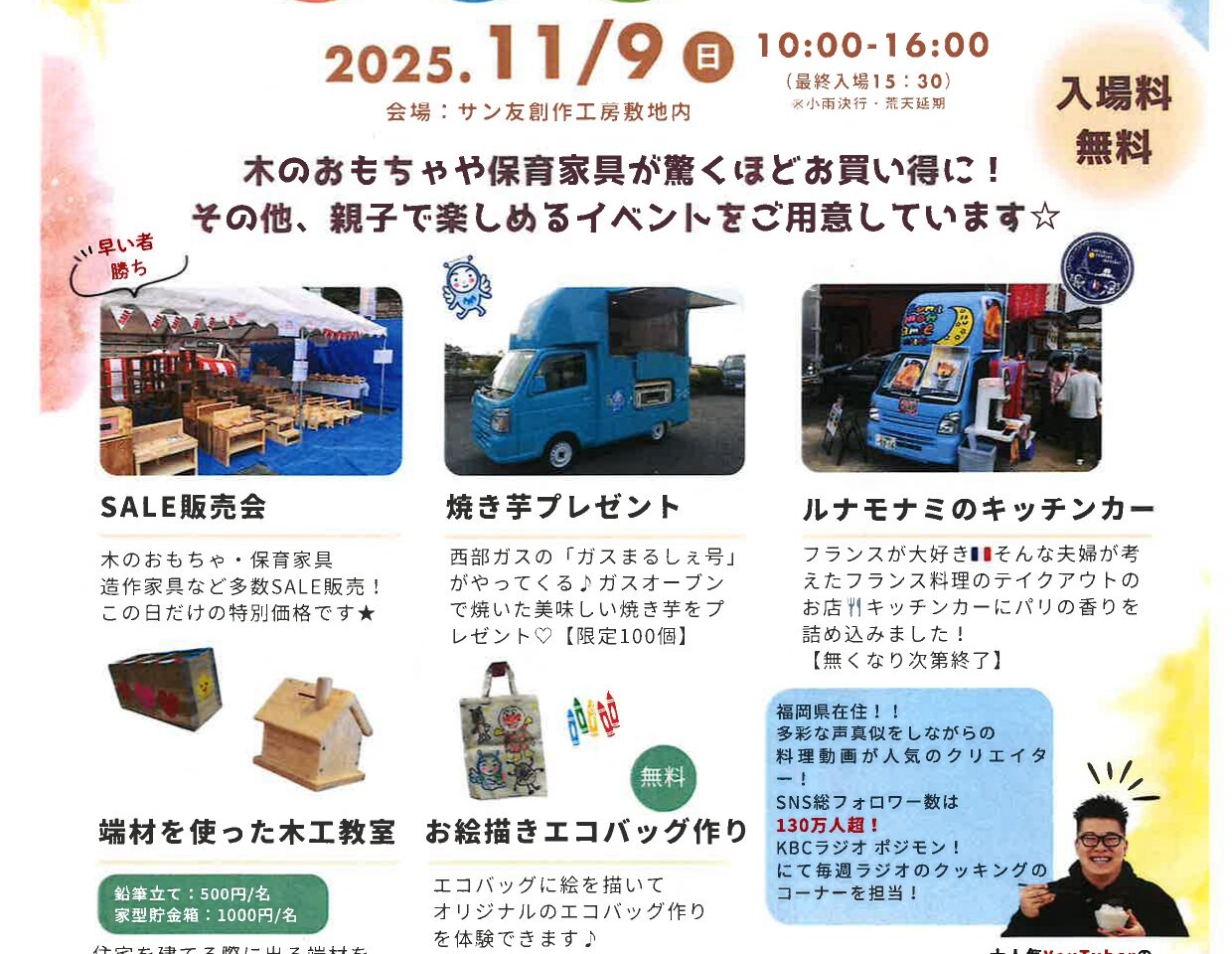 2025年11月9日開催。やきいも配布や木工体験も♪小倉南区で「木のおもちゃ・家具 大決算SALE」開催されます!