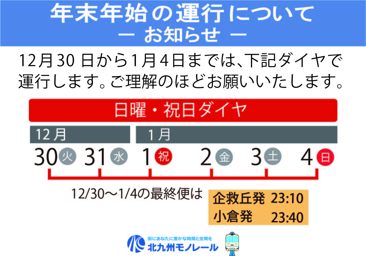 年末年始の北九州モノレールの運行ダイヤ・定期券発売所の営業