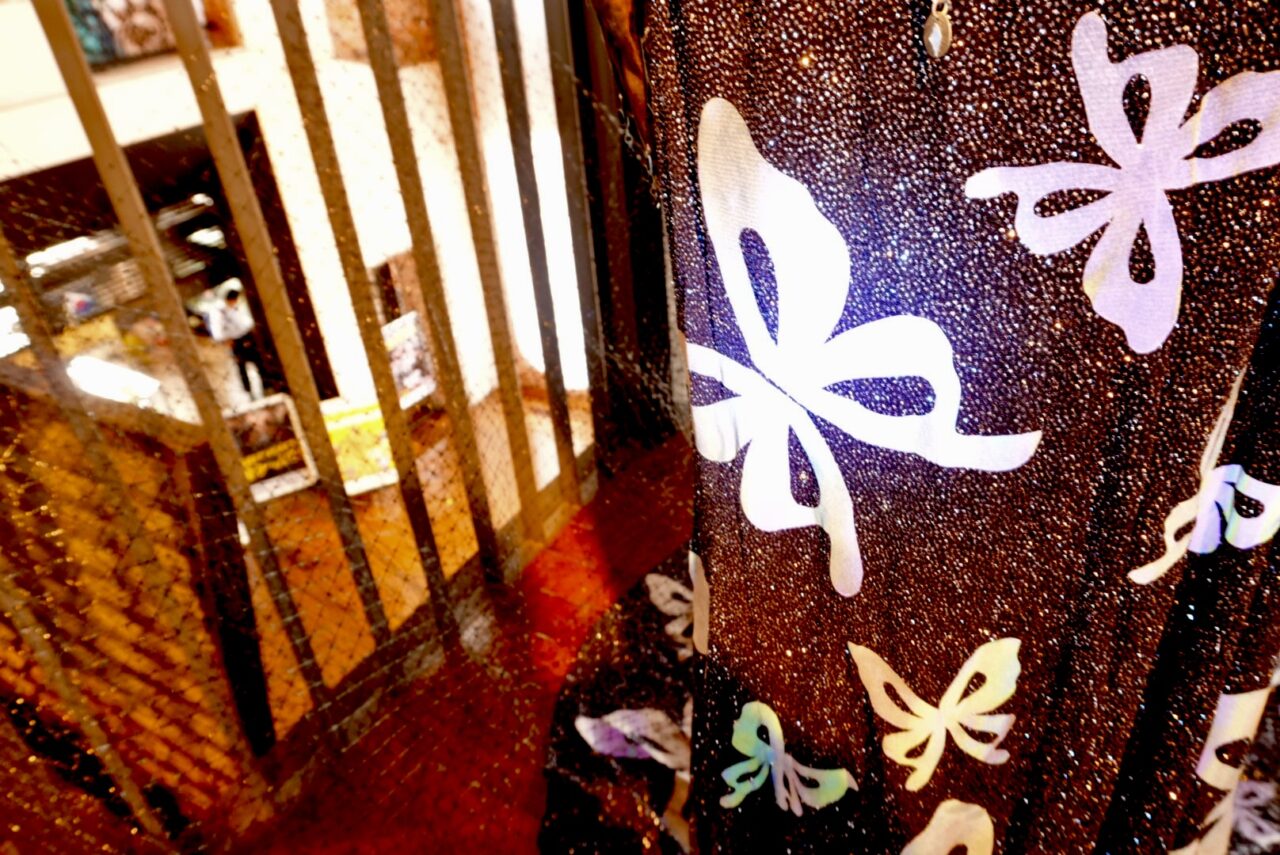 部分的に照らすと色の違いがはっきりとわかります。実はこちらのドレスに反射材が使用されているのです。「お洒落と安全性の両立」をテーマに、2012年に小倉北警察署の秋の交通安全運動の際に反射材を使用したドレスがはじめて製作された後、反射材を使ったドレスの製作を続けていらっしゃるんだそう。2026年もこちらの素敵なドレスが展示されています。