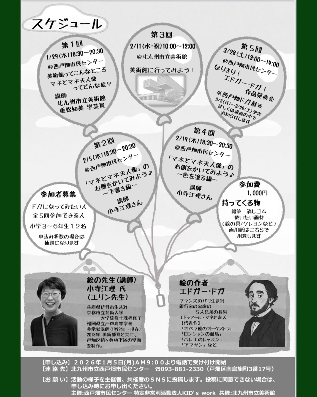 2026年1月29日から2026年3月28日の期間(全5回)で、戸畑区内の小学生を対象に美術に特化した講座が開催されます。