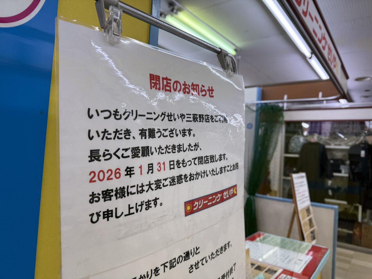 クリーニングせいや三萩野店は本日2026年1月31日に閉店。