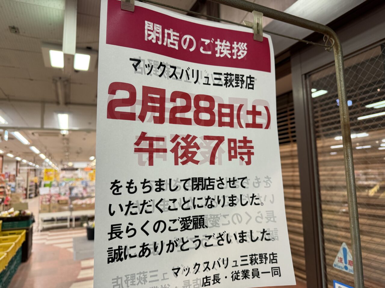 マックスバリュ三萩野店も2026年2月28日午後7時に閉店、というお知らせがありました。