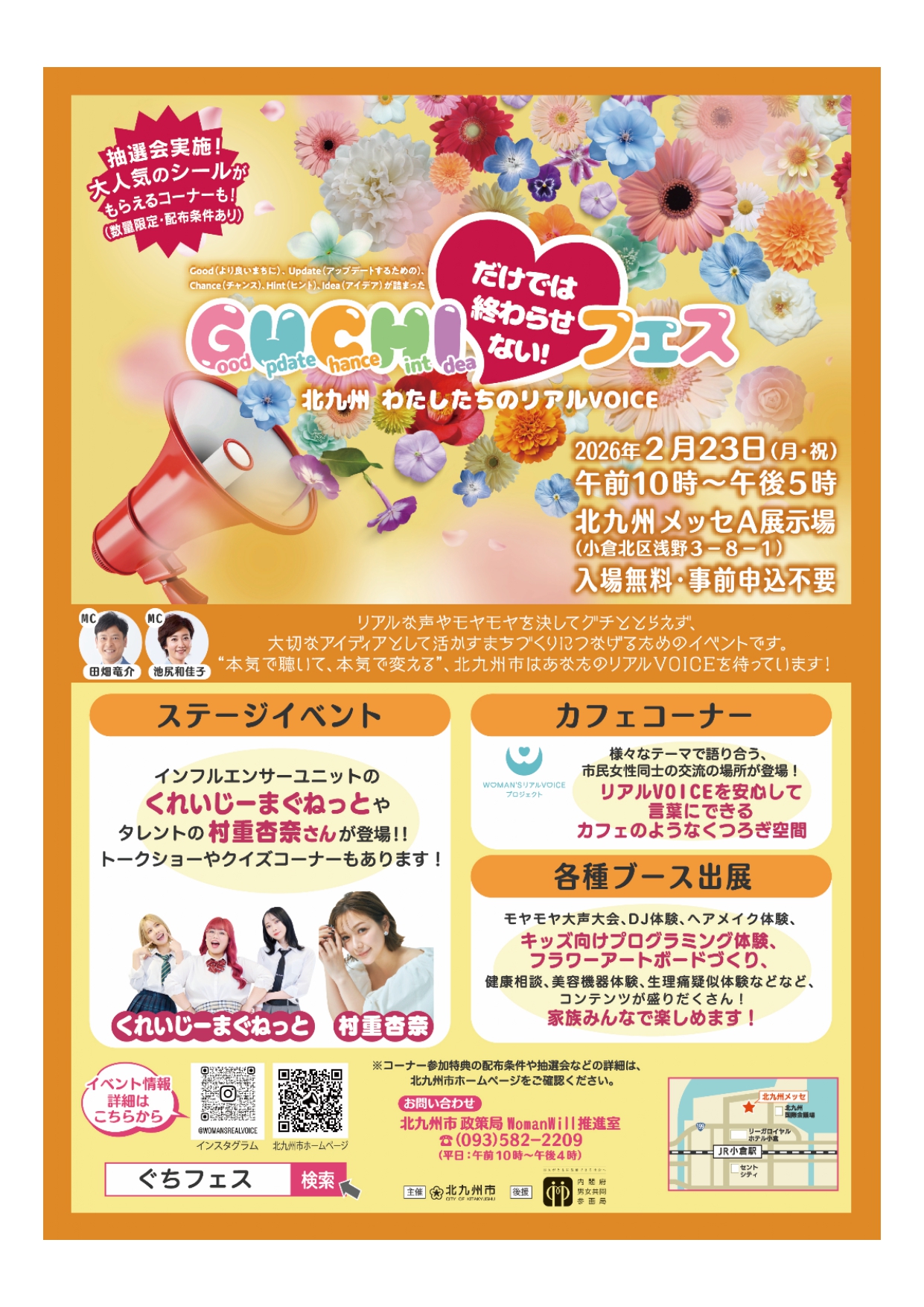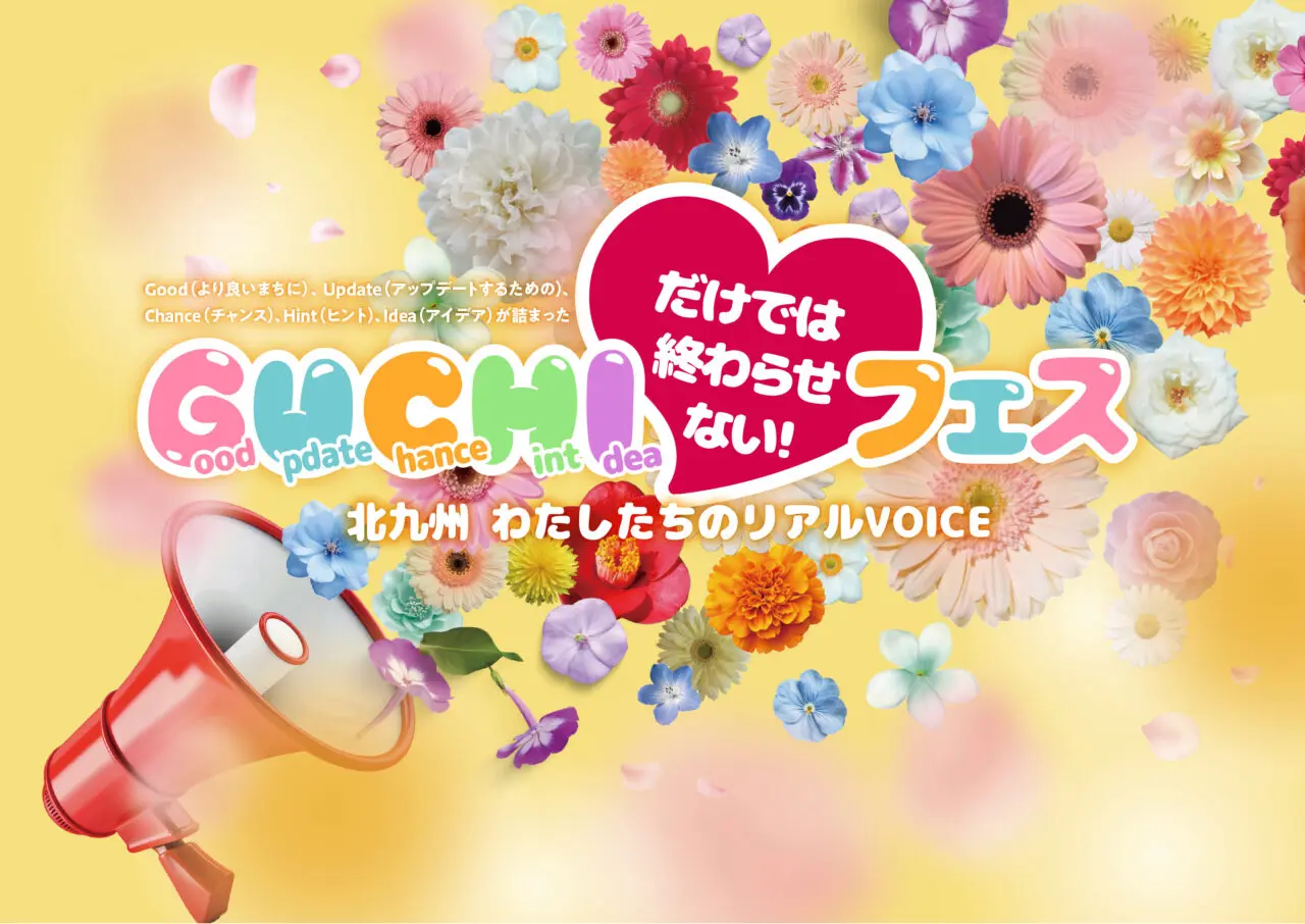 女性のリアルボイスには、北九州をより良い街へとアップデート(Good Update)するための、チャンス(Chance)、ヒント(Hint)、アイデア(Idea)がたくさん!リアルボイスに含まれる4つのワードの頭文字から名付けられたイベント「GUCHIだけでは終わらせない!フェス」が2026年2月23日に北九州メッセ A展示場で開催されます。
