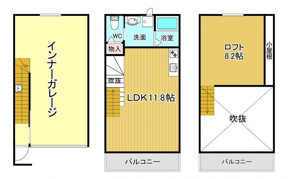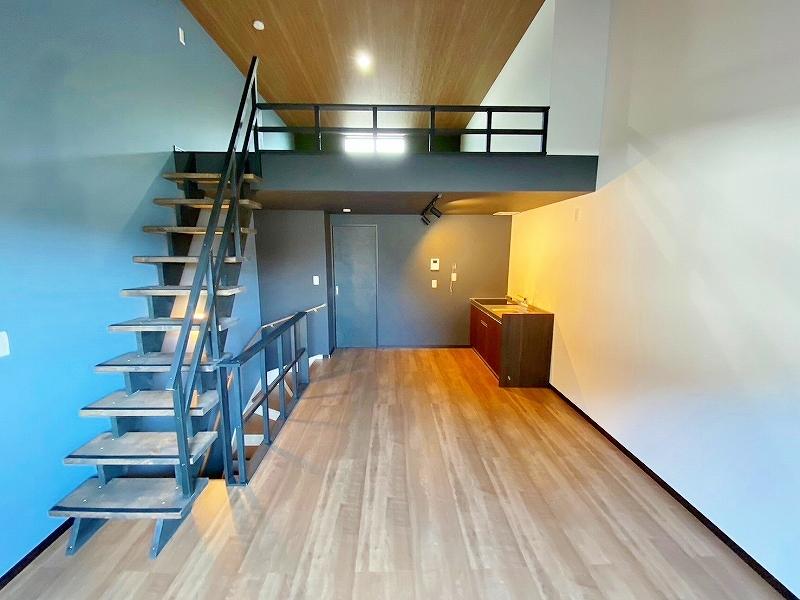 他の賃貸では味わえない天井高を活かしたロフトスペースを備え、空間を有効活用できます。寝室として使うのはもちろん、趣味のスペースや収納スペースとしても活用可能。ロフトがあることで室内の広がりを感じられ、実際の面積以上のゆとりある住空間を演出します。子供心にこんなスペースにテントを張ってみたくなるような空間です!ガレージと居住空間を上手に分けることで、生活と趣味の時間を快適に楽しめる設計となってるのがにくいです。ロフト付きで空間を広く使えるのもポイントで、ロフトは居住面積に入らないので実際は40平米オーバーのお部屋で1LDKと遜色ない広さがあります!