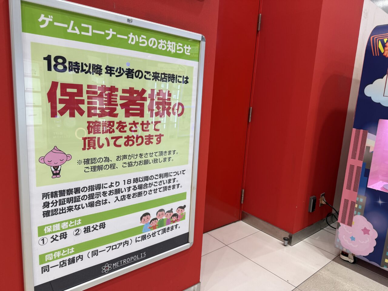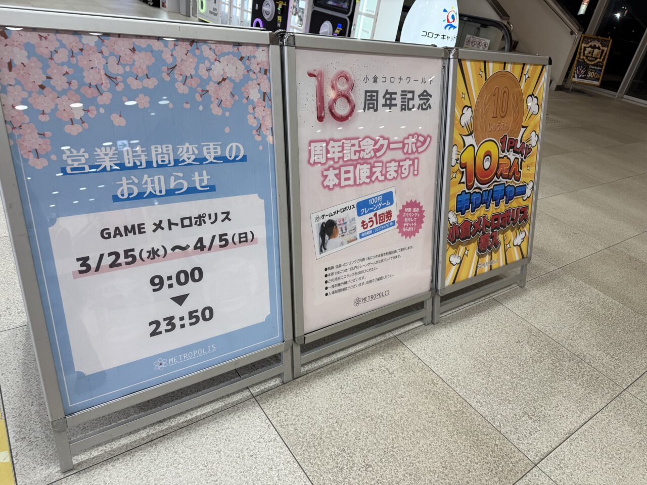 小倉コロナワールド内のゲームセンター「GAMEメトロポリス」で、営業時間変更のお知らせが掲示されていました。